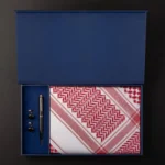 • يتألف الطقم من شماغ احمر تقليدي مصنوع من أجود أنواع القطن العالي الجودة وقلم وكبك يتميز بتصميمه الجميل والألوان المشرقة والمتناغمة .